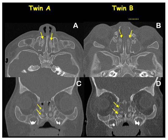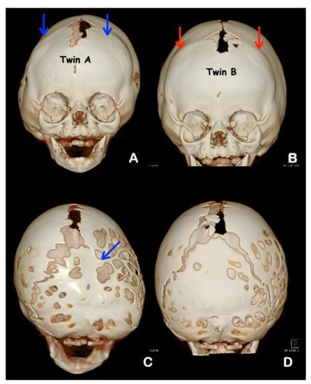 - Sher, S.; Cole, P.; Kaufman, Y.; Hatef, D.A.; Hollier, L. Craniosynostotic variations in syndromic, identical twins. Ann. Plast. Surg. 2008, 61, 290–293. [Google Scholar] [CrossRef] [PubMed]