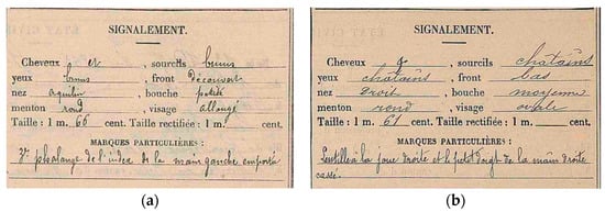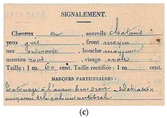 In the search for identity, every clue leading to the singularity of a body compared to another is precious information. As for stature and age, the military documents mentioned some medical particularities for each soldier (e.g., Figure 2). Unfortunately, tooth conditions are rarely mentioned, except for very specific ones such as dentures. However, condition indications are still useful for distinguishing one identity from another. The pathologies sought with priority are antemortem fractures (with a consolidation long before the war), amputations, any noteworthy features on bone shapes, or dentures. Anatomical variations are also important for such identity-search purposes and can also be used in forensic anthropology [24]: those with visible body consequences, such as spina bifida occulta, can also be reported in military documents.