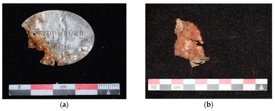 Besides biological profiling, a large part of identity research is based on artefacts found with corpses. According to their nature, they provide different information (e.g., Table 4). Some objects can provide temporality, such as the famous red French pant from the beginning of WWI, while others can indicate nationality, and some can even provide identities (e.g., Figure 3). Given the known importance of artefacts, fine excavation, as performed in archeology, is essential. The association of an artefact with the right skeleton, determining its position and, even more simply, finding it are key steps in the identification process. Through the years, 19 soldiers have been identified thanks to artefacts, mostly by military ID tags but also by engraved personal objects.