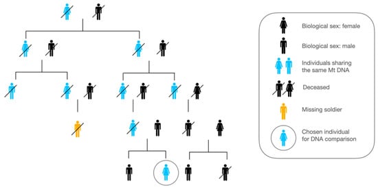 DNA from bones (long bones or teeth) is amplified, sequenced [32] and compared to the DNA of buccal cells from a living parent. This part of the process becomes complicated, especially for those who went missing in WW1. As time goes by, and generations follow one another, it becomes more and more difficult to find a living person whose DNA comparison would allow a certain identification of the soldier found [26].