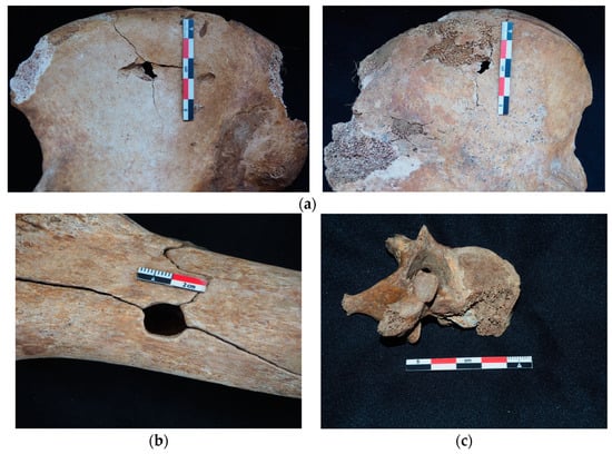 As surprising as it may seem, historical sources provide very little information on the real causes of death in combat. On such a subject, it is obvious that a paleopathological reading of the remains of soldiers constitutes an exceptional opportunity to objectify, in many cases, peri-mortem traumas, some of which may have been the causes of death (e.g., Figure 5). No body parts are exempt from trauma, and ballistic impacts are observed on the skull as well as the rest of the skeleton.