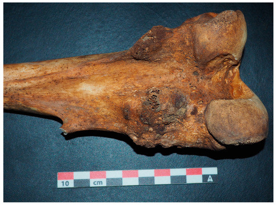 Soldiers’ remains are important biological archives for better understanding the health context of this period at the turn of the 20th century. These bodies bear traces of both their past illnesses (such as the Russian flu) and their latest infections [46,47,48]. Here, again, technical and methodological advances in paleogenomics and paleoculture have made it possible to identify these traces of infection on human remains. In some cases, the cross-referencing of data from the study of bones and the results of pathogen identification allow a better understanding of the causes of death, such as the demonstration of a septic condition of a previously wounded soldier caused by gangrene [46]. In some cases, this pathological study can even be used to assess the health statuses of these young populations (to estimate the prevalence of certain diseases), such as the detection of cancerous lesions (e.g., Figure 6).