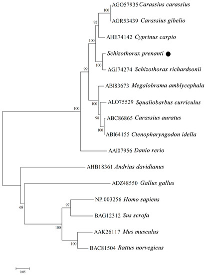 Phylogenetic tree of relationships between S. prenanti TLR3 and other vertebrates. Tree was constructed by neighbor-joining method using MEGA 4.0 software. Numbers at nodes indicate proportions of bootstrapping after 1,000 replications. ● S. prenanti TLR3.