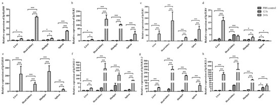 SPSS 22.0 and Graphpad Prism 5.0 software was used for data analysis and histogram, respectively. The mRNA expression levels were analyzed by using One-way ANOVA method. All data are presented as the mean ± standard error (n = 4), and the statistically significant differences between PBS control and LPS treatment groups at each time point are expressed with asterisks, * p < 0.05, ** p < 0.01, *** p < 0.001 vs. corresponding control group at the time points.