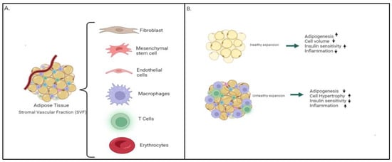 It is well known that obesity leads to a chronic inflammatory state and associated pathophysiological sequelae such as insulin resistance, altered lipid metabolism and ectopic lipid deposition (Figure 1B). Normally, early stages of adipocyte adaptation, whether located in subcutaneous or visceral depots, involve the release of controlled inflammatory signals that are required for proper adipose tissue remodeling and expansion including hyperplasia and hypertrophy. In an environment with excess caloric intake, adipose tissue expansion is an important systemic response to lipotoxic effects from fatty acids. Significant expansion of adipose tissue stimulates angiogenesis and extracellular matrix remodeling []. A study using a mouse model demonstrated that blocking the local pro-inflammatory response in adipocytes reduced adipose tissue growth []. Whether adipose tissue expansion in the development of obesity occurs primarily by hyperplasia or hypertrophy or due to adipose tissue dysfunction is a matter of debate []. When obesity and inflammation are sustained and the adipocyte diameter increases, a dysfunctional homeostatic process emerges, which is characterized by impaired secretion of adipokines, abnormal lipid storage, adipogenesis, increased fibrosis and insulin resistance []. During obesity, adipocytes can rapidly reach a threshold of oxygen limit during growth, therefore leading to hypoxic conditions.