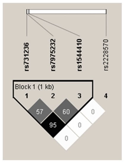 Linkage disequilibrium between different VDR polymorphic variants was analyzed with Haploview 4.2 software.