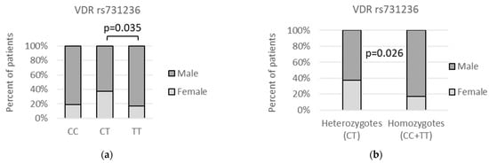 We have also found that the VDR rs731236 CT genotype was far more common among female (F) than male (M) patients in both codominant (CT vs. TT: (18/48 (37.5%) vs. 7/42 (16.7%); p = 0.035) and over-dominant (CC + TT vs. CT: 10/58 (17.2%) vs. 18/48 (37.5%); p = 0.026) models, as presented on Figure 2. Sadly, we were unable to perform similar analysis for the control group, as the sex of the healthy transplant donors has not been revealed to us.