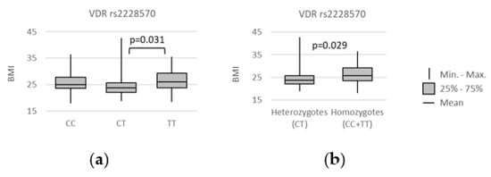 Relationships between VDR rs2228570 genotypes and patients’ body mass index (BMI), measured in kg/m2. The following statistically significant associations were found: (a) CT vs. TT, p = 0.031; (b) CC + TT vs. CT, p = 0.029. Analysis was performed using unpaired two-sample Wilcoxon test.