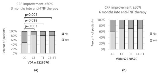 We observed that an improvement equal to or higher than 50% in CRP after 3 months of anti-TNF therapy was associated with VDR rs2228570 genetic variants (Figure 4a). Lack of CRP improvement ≥50% after 3 months of anti-TNF therapy was related to the presence of the CC genotype. It was shown by dominant (CC vs. CT + TT: 16/32 (50%) vs. 13/71 (18.3%); p = 0.002) and codominant (CC vs. CT: 16/32 (50%) vs. 8/46 (17.4%); p = 0.003; CC vs. TT: 16/32 (50%) vs. 5/25 (20%); p = 0.028) models.
