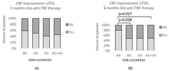 As for the time point of 6 months after beginning of the treatment, the rs1544410 AA genotype was statistically more often observed among individuals who achieved CRP improvement equal to or higher than 75%, as shown by the dominant (AA vs. AG + GG: 12/15 (80%) vs. 42/87 (48.3%); p = 0.027) and the codominant (AA vs. AG: 12/15 (80%) vs. 22/46 (47.8%); p = 0.038) model (Figure 5b).