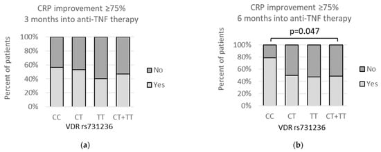 Similar observation was also made for the VDR rs731236 polymorphism. Here, 6 months after beginning anti-TNF therapy, the rs731236 CC genotype was related to CRP improvement equal to or greater than 75%, as compared to the T allele (11/14 (78.6%) vs. 43/88 (48.9%); p = 0.047) (Figure 6b).