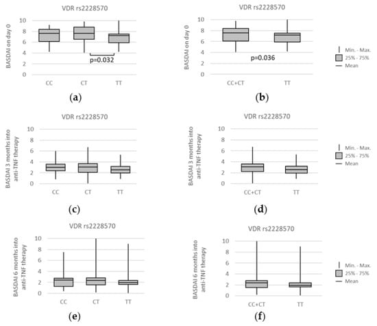 Further statistical analysis revealed some noteworthy relations between the Bath Ankylosing Spondylitis Disease Activity Index (BASDAI) and the studied VDR polymorphisms. The first one worthy of mentioning was concerning the VDR rs2228570 polymorphism. Namely, median BASDAI before anti-TNF therapy was lower for individuals with the TT genotype, under the codominant model (CT vs. TT: median (IQR) = 7.65 (6.38–8.8) vs. 7.20 (5.55–7.5); p = 0.032) and the recessive model (CC + CT vs. TT: median (IQR) = 7.60 (6.1–8.4) vs. 7.20 (5.55–7.5); p = 0.036). Relationships between VDR rs2228570 genotypes and BASDAI at different time points of the treatment, as well as all statistically significant associations found, are presented on Figure 8.