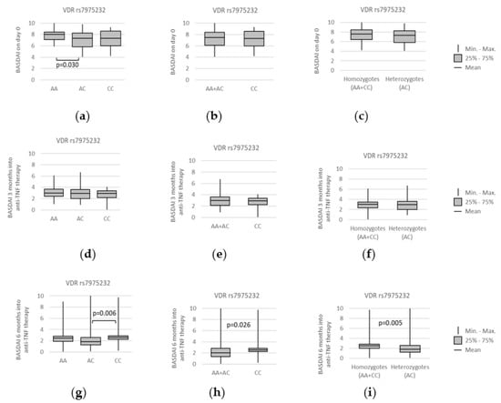All the above-mentioned relationships have not been preserved over time, and none of the studied VDR polymorphisms seemed to relate to BASDAI when 3 months have passed. However, this changed 6 months after the beginning of the anti-TNF treatment. At this time point, median BASDAI values were lower for rs7975232 AC heterozygotes under the over-dominant (AA + CC vs. AC: median (IQR) = 2.50 (1.95–2.85) vs. 1.80 (1.17–2.65); p = 0.005), as well as the codominant model (AC vs. CC: median (IQR) = 1.80 (1.17–2.65) vs. 2.55 (2.18–2.88); p = 0.006). The graphical representation of those associations can be found on Figure 9g,i.