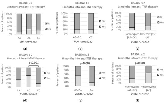 Relationships between VDR rs7975232 genetic variants and percent of patients achieving remission (BASDAI equal to or lower than 2 after (a–c) 3 months and (d–f) 6 months into the anti-TNF treatment. Prior to the therapy, BASDAI scores were above 4 for all the patients; therefore, this time point was not included in the current analysis. The following statistically significant associations were found after 6 months of the therapy: (d) AC vs. CC, p < 0.001, OR(95%CI) = 6.96 (2.30 to 18.52); (e) AA + AC vs. CC, p = 0.002, OR(95%CI) = 5.20 (1.75 to 13.4); and (f) AA + CC vs. AC, p = 0.001, OR(95%CI) = 0.26 (0.11 to 0.60). Analysis was performed using Fisher‘s exact test.
