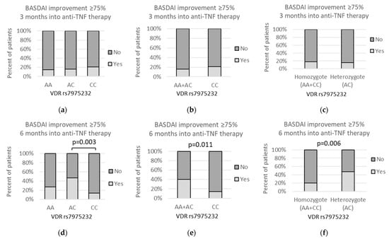 Relationships between VDR rs7975232 genetic variants and percent of patients with BASDAI improvement ≥75% after (a–c) 3 months and (d–f) 6 months into the anti-TNF treatment. The following statistically significant associations were found after 6 months of the therapy: (d) AC vs. CC, p = 0.003, OR(95%CI) = 5.53 (1.67 to 16.2); (e) AA + AC vs. CC, p = 0.011, OR(95%CI) = 4.17 (1.40 to 11.9); and (f) AA + CC vs. AC, p = 0.006, OR(95%CI) = 0.28 (0.12 to 0.65). Analysis was performed using Fisher‘s exact test.