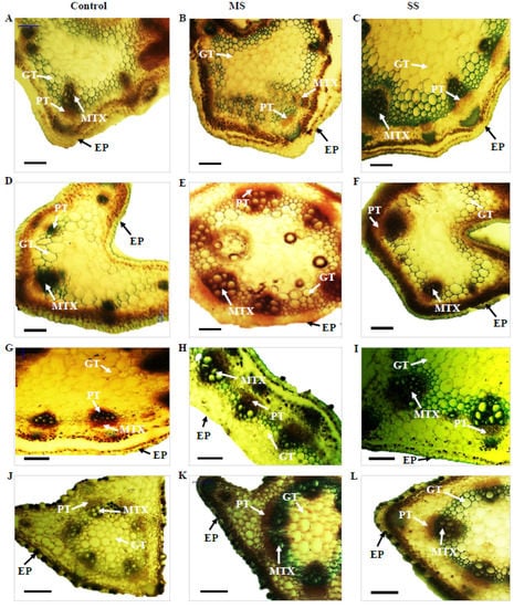 - Nassar, R.M.; Kamel, H.A.; Ghoniem, A.E.; Alarcon, J.J.; Sekara, A.; Ulrichs, C.; Abdelhamid, M.T. Physiological and anatomical mechanisms in wheat to cope with salt stress induced by seawater. Plants 2020, 9, 237. [Google Scholar] [CrossRef] [PubMed]