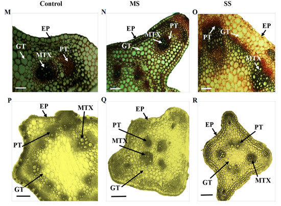 Transverse section of the stem of Vicia species showing variation in the studied anatomical traits, i.e., epidermis (EP), metaxylem (MTX), phloem (PT), and ground tissues (GT); (A) V. sativa subsp. sativa control, (B) V. sativa subsp. sativa 55% FC, (C) V. sativa subsp. sativa 30% FC, (D) V. sativa subsp. nigra control (E) V. sativa subsp. nigra 55% FC, (F) V. sativa subsp. nigra 30% FC, (G) V. narbonensis control, (H) V. narbonensis 55% FC, (I) V. narbonensis 30% FC, (J) V. bithynica control, (K) V. bithynica 55% FC, (L) V. bithynica 30% FC, (M) V. faba control, (N) V. faba 55% FC, (O) V. faba 30% FC, (P) V. monantha control, (Q) V. monantha 55% FC, (R) V. monantha 30% FC. Bar scale 100 μm.
