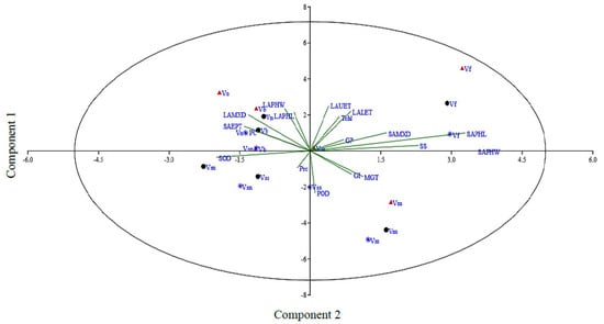 Principal component analysis of the studied attributes in Vicia species evaluated under pot induced drought stress (control, FC = 80%; moderate stress, FC = 50%; severe stress, FC = 30%, represented by black, blue, and crimson colors, respectively). Vss, V. sativa subsp. sativa; Vsn, V. sativa subsp. nigra; Vn, V. narbonensis; Vb, V. bithynica; Vf, V. faba; Vm, V. monantha.