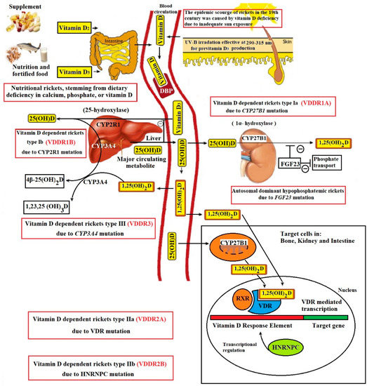 - Roizen, J.D.; Li, D.; O’Lear, L.; Javaid, M.K.; Shaw, N.J.; Ebeling, P.R.; Nguyen, H.H.; Rodda, C.P.; Thummel, K.E.; Thacher, T.D.; et al. CYP3A4 mutation causes vitamin D-dependent rickets type 3. J. Clin. Investig. 2018, 128, 1913–1918. [Google Scholar] [CrossRef]