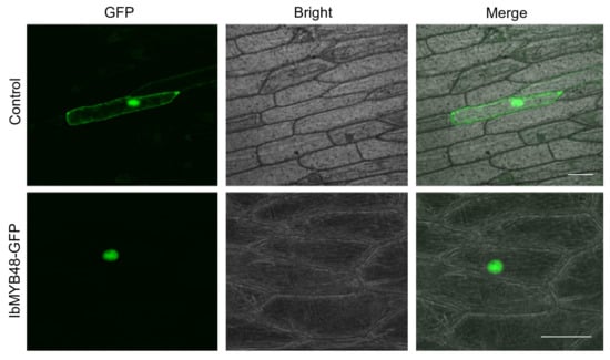 To explore the subcellular localization of the IbMYB48, we performed a transient expression experiment of IbMYB48 in onion epidermal cells. The C terminus of IbMYB48 was fused with GFP under the control of the CaMV 35S promoter, and the construct was introduced into onion epidermal cells using gene gun method []. In the cells expressing GFP alone, the signal was detected in the cytoplasm and nucleus. In contrast, the green fluorescence signal from the IbMYB48-GFP fusion protein was mainly detected in the nucleus, indicating that IbMYB48 is a nucleus protein (Figure 3).