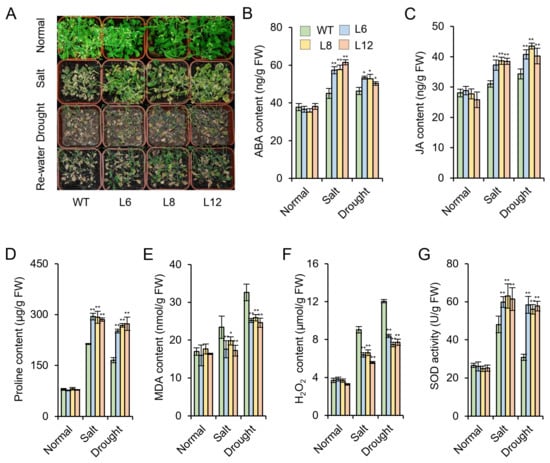 Furthermore, transgenic plants and WT seedlings were grown in pots and regularly watered for 10 days. The plants were then watered with 100 mM NaCl or 300 mM mannitol every 2 days for 3 weeks. The drought treatment adopted the natural drought method for 3 weeks, and the plant growth status was observed after the re-watering treatment for 2 days. The contents of ABA, JA, proline, MDA, H2O2 and SOD were measured by the methods of Zhai et al. [], Zhou et al. [] and Kang et al. [].