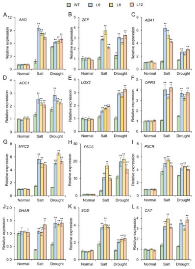 The expression profile of stress-related genes in transgenic lines and WT under salt and drought treatments for 2 weeks. The aerial parts of transgenic and WT plants were collected to extract total RNA. qRT-PCR analysis of the expression of ABA biosynthetic genes (A–C), JA biosynthesis and signaling pathway genes (D–G), proline biosynthetic genes (H,I) and ROS-scavenging genes (J–L). Values are indicated as means ± SE (n = 3); Asterisk (**) indicates that there is a significant difference at p < 0.01, individually. AAO, ABA-aldehyde oxidase; ZEP, zeaxanthin epoxidase; ABA1, ABA-deficient 1; AOC1, allene oxide cyclase 1; LOX2, 13-lipoxygenase 2; OPR3, 12-oxophytodienoate reductase 3; P5CS, pyrroline-5-carboxylate synthase; P5CR, pyrroline-5-carboxylate reductase; DHAR, dehydroascorbate reductase; SOD, superoxide dismutase; CAT, catalase.