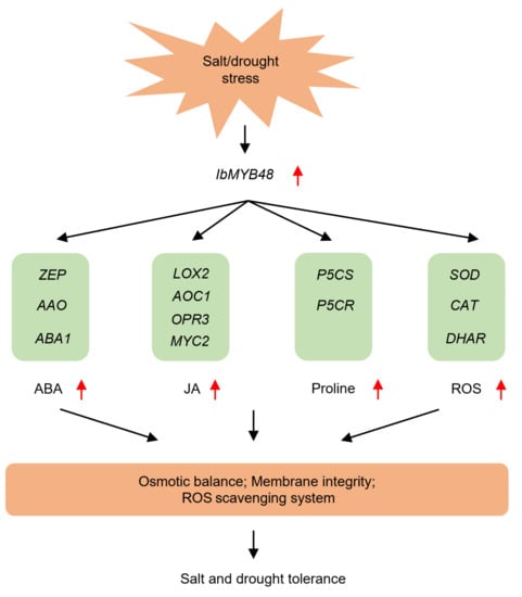 Taken together, these results reveal that the ABA biosynthetic pathway, JA biosynthesis and signaling pathway and ROS-scavenging system are activated by overexpression of IbMYB48, thus improving abiotic stress tolerance of transgenic plants (Figure 9). However, IbMYB48 is only heterologously expressed in Arabidopsis for correlated functional validation. In the future, we will further investigate the potential function of IbMYB48 in salt and drought tolerance by using gene-editing technology.