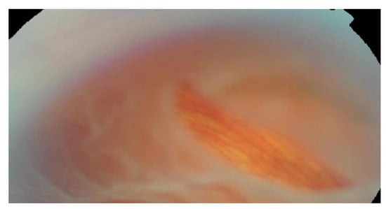 Horseshoe tears (HST) often appear as U-shaped retinal “flaps”, due to vitreous detachment, causing full-thickness breaks of the neurosensory retina (Figure 2). The estimated incidence of a horseshoe retinal tear in patients with acute PVD is 8%, with this type of retinal tear accounting for over 80% of all cases of retinal detachment [51,52]. This sub-group is also the most urgent with rapid progression to macular involvement.