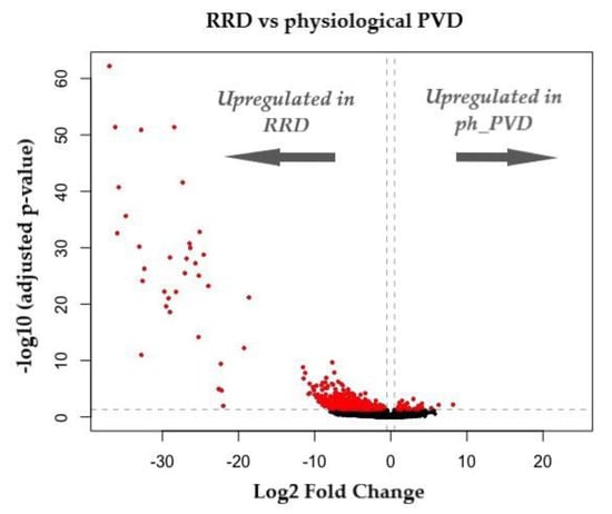 Volcano plot representing DEGs (differentially expressed genes) between RRD and physiological PVD. Log2 FC indicates the mean expression level for each gene. Each dot represents one gene. Red dots are indicative of statistically significant genes (adjusted p < 0.05) and log2FC < 0.5) (unpublished data).