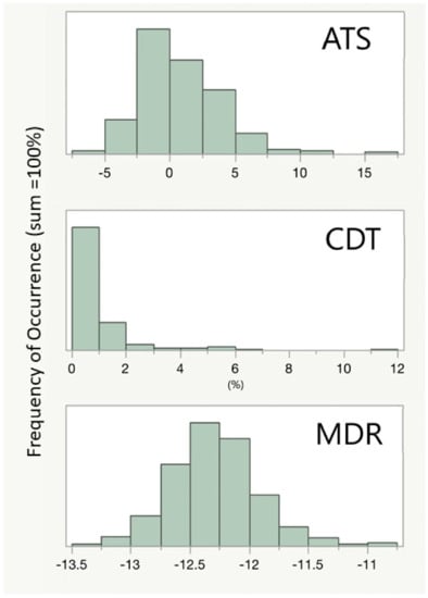 The distribution of the ATS, CDT and the MDR in the FACHS T population. Both the ATS and the MDR are unitless. The CDT is expressed as percent of total transferrin.
