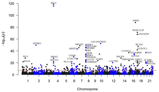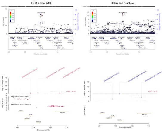 Significant associations between m6A-SNPs and fracture were found, including rs115790973 (p = 1.00 × 10−11) and rs6815946 (p = 3.80 × 10−11) in IDUA (Figure 2), rs1983490 in LINC02594 (p = 3.60 × 10−13), rs2342312 in WHSC1L2P (p = 4.40 × 10−13) and rs8079310 in ATXN7L3 (p = 1.20 × 10−10). The m6A-SNP rs10896350 in PPP6R3 was significantly associated with LS-BMD (p = 3.68 × 10−11); rs1983490 in LINC02594 was significantly associated with LS-BMD (p = 2.88 × 10−8) and FN-BMD (p = 6.63 × 10−9). In addition, nominal significant associations were found for the known OP susceptibility genes, including the association between rs7536301 in WNT4 and LS-BMD (p = 8.52 × 10−5), the association between rs12044635 in WLS and FN-BMD (p = 1.94 × 10−5), the association between rs62470375 in SEM1 and FN-BMD (p = 7.13 × 10−5), the association between rs80233229 in JAG1 and LS-BMD (p = 1.77 × 10−6) and the associations between rs273605 in DCDC1 and FN-BMD (p = 1.30 × 10−6) and LS-BMD (p = 3.16 × 10−7).