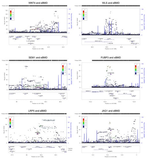 Association signals of m6A-SNPs with eBMD. The six regional association plots show the associations between m6A-SNPs in key OP susceptibility genes and eBMD. The m6A-SNPs in each gene locus are annotated in the plot.