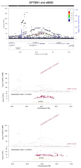 In SMR analysis of integration of BMD GWAS with eQTL data from the GTEx project, we detected significant associations between gene expression in five related tissue types (whole blood, adipose, skeletal muscle, liver and ovary) and eBMD and fracture. A total of 142 significant pleotropic associations were detected for 23 of the genes containing RNAm-SNPs (SMR p < 5.0 × 10−6) (Supplementary Table S3). The number of significant associations found in each tissue was 77 in whole blood, 37 in adipose tissue, 19 in skeletal muscle, 4 in liver and 4 in ovary. In SMR analysis, we found that the expression levels of some OP susceptibility genes were significantly associated with eBMD in the five related tissue types. The expression of FGFRL1 was associated with eBMD (p = 1.61 × 10−8) and fracture (p = 1.24 × 10−5) in skeletal muscle (Figure 2); the expression levels of SPTBN1 were associated with eBMD in whole blood and adipose tissue (p = 3.15 × 10−16 and 6.55 × 10−10, respectively) (Figure 4).