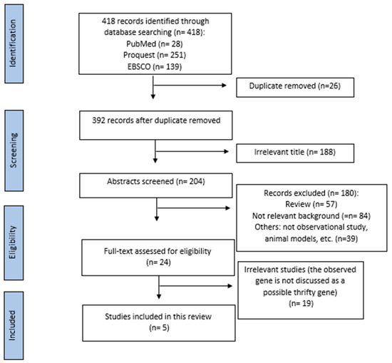 This review was conducted based on the Preferred Reporting Item for the Systematic Reviews and Meta-Analysis (PRISMA). The selected article were then filtered, the irrelevant title of studies were excluded, and further review of the full-text articles assessed for eligibility are taken and reviewed individually by two authors. A total of 418 articles were identified through three databases (Pubmed: 28 articles, EBSCO: 139 articles, Proquest: 251 articles) using the keyword: thrifty gene AND diabetes mellitus between January, 2009–September, 2022. After removing duplicates and excluding irrelevant titles, 204 articles were included for further assessment. We further excluded 180 articles by reading each article’s title and abstract, and the eligibility of the remaining 24 full-text articles was evaluated. Finally, a total of five studies were included in the present study. Data extraction of the studies was done using an Excel table. Figure 1 depicts the flowchart of the articles included in our study.