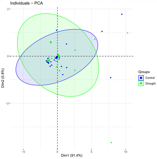 Clustering and principal component analysis (PCA) was obtained using the “factoextra” program [30]. We used PCA to assess each drought gene’s contributions to the drought-treated and control wheat plants. The genes from the control case were more important in separating the groups than the parameters that had been subjected to drought. (Figure 5). Among the eleven drought genes, three genes from control condition samples (blue-colored data points) covered an overall greater distance compared to the drought-treated groups, and thus, are considered positively correlated.