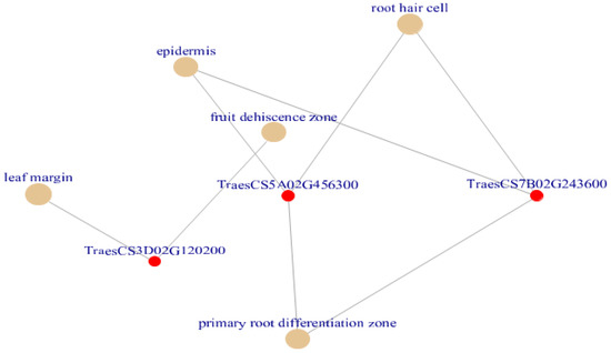 The gene collection was collectively annotated for plant keywords, some of which we thought were compatible with BP-response to auxin (e.g., as for TraesCS6A02G328700 with PO- cauline leaf, shoot apex, rib zone, inflorescence meristem, root, seed and plant embryo, vascular leaf, flower, sepal, petal, flower pedicel, gynoecium, receptacle, hypocotyl, collective leaf structure, plant embryo cotyledonary stage, mature plant embryo stage, plant embryo globular stage, plant embryo bilateral stage, petal differentiation and expansion stage and flowering stage); CC-cytosol; MF-oxidoreductase activity (e.g., as for TraesCS2D02G000200 with PO-cauline leaf, shoot apex, inflorescence meristem, guard cell, leaf lamina base, shoot system, plant embryo, vascular leaf, stamen, carpel, sepal, petal, flower, stem, cotyledon, petiole, hypocotyl, leaf apex, collective leaf structure, vascular leaf senescent stage, plant embryo bilateral stage, LP.12 twelve leaves visible stage, LP.08 eight leaves visible stage, LP.02 two leaves visible stage, LP.10 ten leaves visible stage, LP.04 four leaves visible stage, LP.06 six leaves visible stage, petal differentiation and expansion stage, and flowering stage); CC-integral component of membrane (e.g., as for TraesCS5A02G456300 with PO- root hair cell, guard cell, primary root differentiation zone, and epidermis) BP-regulation of transcription, DNA-templated; CC-nucleus; MF-DNA-binding transcription factor activity, RNA polymerase II-specific (e.g., as for TraesCS6A02G240400 with PO- cauline leaf, shoot apex, inflorescence meristem, guard cell, leaf lamina base, fruit, root, shoot system, plant embryo, portion of vascular tissue, vascular leaf, carpel, petal, stamen, flower, sepal, stem, flower pedicel, cotyledon, hypocotyl, collective leaf structure, pollen, vascular leaf senescent stage, plant embryo globular stage, LP.04 four leaves visible stage, LP.06 six leaves visible stage, petal differentiation and expansion stage and flowering stage) (Table 5). Full details of enriched GO and PO terms by inference from network neighbors for each of the 11 genes are given in (Figure 6 and Figure 7, and Supplementary Table S2) which also shows the networking of three classes GO terms and PO terms along with SDGs (p < 0.05) candidates from clusterProfiler.
