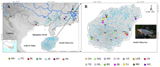 Continental islands, due to their close proximity to neighboring continental areas, provide excellent opportunities for understanding the origin and diversification of freshwater fishes [1]. During glacial phases, the islands and the mainland were connected by land bridges due to the decrease in sea level. Many studies provide evidence supporting continental islands receiving their freshwater fishes directly from the adjacent mainland [2]. Adjacent to the southern margin of mainland China are numerous continental shelf islands, and the islands of Taiwan and Hainan present the two largest islands. Hainan Island is slightly smaller in size than Taiwan but contains a higher diversity of freshwater fishes than Taiwan. The high degree of diversity for the freshwater fishes of Hainan compared with Taiwan Island reflects the weak effect of geographical isolation due to the Qiongzhou Strait, which is approximately 70 km long and 30 km wide, with a maximum depth of 120 m, and Hainan is separated from mainland China. Previous studies on the phylogeography of freshwater fishes between the island and mainland have focused on Taiwan and mainland China (e.g., Onychostoma barbatulus [3]; Squalidus argentatus [2]; Cobitis sinensis [4]; Opsariichthys [5]; Rhodeus ocellatus [6]; Acrossocheilus paradoxus [7]). There is relatively little information available on the phylogeography of freshwater fishes between Hainan Island and mainland China (e.g., Garra orientalis [8]; Aphyocypris normalis [9]; O. hainanensis [10]; Channa gachua [1]).