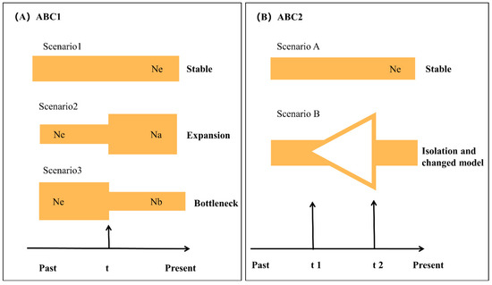 The demographic history of O. hainanensis was determined by approximate Bayesian computation (ABC) methods using DIYABC v.2.0.4 [43]. ABC analysis performed the computations by combining both microsatellite DNA and mtDNA data. The possible demographic history of O. hainanensis was tested in two steps (Figure 2). First, three potential scenarios were performed to test the changes in population sizes of O. hainanensis, assuming different ancestral (Ne) and current (Na) effective population sizes. These were: (1) a stable size population (Ne = Na), (2) a population expansion (Ne < Na), and (3) a population decline (Ne > Na). Second, based on the most appropriate scenario in the first step, the population size change always reflects the complex history, and the populations might have suffered a bottleneck event followed by a recent population expansion. Therefore, two competing demographic scenarios in ABC 2 analyses were constructed. Scenario A is a stable size population, Ne (long-term historical Ne), and scenario B (bottleneck and expansion model), the populations suffered a bottleneck event followed by a recent population expansion and the effective population size changed during t1 and t2 time. Following the preliminary analysis, three million datasets were simulated to generate the reference table, and all the summary statistics included in the software DIYABC were used [43]. The posterior probability of each model based on 1% of the simulated datasets for each scenario was assessed using both direct and logistic approaches [43].