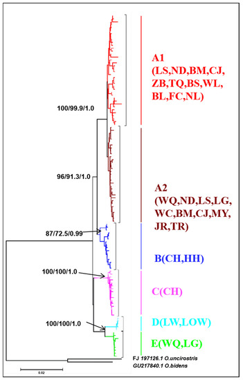 - Ronquist, F.; Huelsenbeck, J.P. MrBayes 3: Bayesian phylogenetic inference under mixed models. Bioinformatics 2003, 19, 1572–1574. [Google Scholar] [CrossRef] [PubMed]