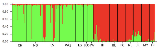 Results of STRUCTURE analysis for 264 O. hainanensis individuals based on microsatellite data. Estimated population structure for K = 2 using the method by Evano [46]. Each individual is represented by a vertical-colored bar, and the separation of the column into two colors represents the probability of membership in the relevant cluster. The x-axis represents individual samples and y-axis represents the proportion of belonging to a certain cluster. Black solid vertical lines separate each population whose names were indicated (code name given in Table 1).