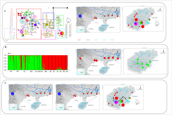 - Chen, W.; Zhong, Z.; Dai, W.; Fan, Q.; He, S. Phylogeographic structure, cryptic speciation and demographic history of the sharpbelly (Hemiculter leucisculus), a freshwater habitat generalist from southern China. BMC Evol. Biol. 2017, 17, 216. [Google Scholar] [CrossRef]