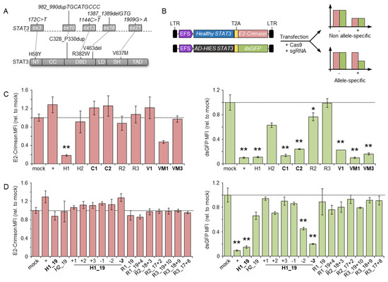 Identification of allele-specific nucleases. (A) Schematics of the STAT3 gene (top) and the corresponding protein domain structure (bottom). The selected mutations at both the DNA and protein levels are highlighted. The STAT3 exons harboring the selected mutations are indicated with grey rectangles. (B) Schematics of the two reporter constructs (left) and principle of the reporter assay. After transfection, the expression level of the marker genes is indicative of the ability of the designer nucleases to discriminate between the healthy vs. the mutated (AD-HIES) STAT3 variant. LTR: long terminal repeat; T2A: 2A self-cleaving peptide. (C,D) Marker gene expression levels. The bar graphs show the mean fluorescence intensity (MFI) of either E2-Crimson (left) or dsGFP (right), respectively, determined by flow cytometry of the transfected cell population (expressing a blue fluorescent protein, not indicated). CRISPR-Cas9 with different designs were used including full-length (C) or truncated and mismatched (D) single guide RNAs named as shown in Table 1. The data summarized at least three biological replicates. Statistically significant differences compared to cells transfected with a mock nuclease (targeting the CCR5 gene) are indicated with an asterisk and the corresponding p-values were calculated with one-way ANOVA followed by Dunnett’s multiple comparisons test (* p < 0.05, ** p < 0.01). Error bars indicate s.e.m. Allele-specific nucleases are highlighted in bold. NT: N-terminal domain; CC: coiled-coil domain; DBD: DNA binding domain; LD: linker domain; SH: Src Homology 2 domain; TAD: transcriptional activation domain; +: nuclease targeting the GFP gene.