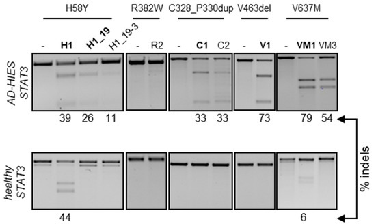 Having identified at least one allele-specific nuclease for four out of the five STAT3-HIES alleles, we sought to validate their activity in the genomic context. We hypothesized that episomal targeting of the fluorescent reporters might be facilitated by the absence of chromatin and targeting efficiency might be negatively affected in the context of the target genome. To this end, we generated a HEK293T reporter cell line stably expressing the dsGFP-reporter containing the STAT3 allele harboring the five selected STAT3-HIES mutations (HEK-STAT3mut) via lentiviral transduction, as previously described [23]. Upon clonal expansion, we measured the copy number of the integrated reporter via droplet digital PCR. As a control, the copy numbers of a reference gene (PTBP2) and of STAT3 were measured in human-derived peripheral blood mononuclear cells (PBMCs) and the parental HEK293T cells. While PBMCs harbored two copies of each gene, hypotriploid HEK293T cells had four copies of STAT3 and three copies of PTBP2, respectively (Table S2). We performed the same analysis in two HEK-STAT3mut clones and confirmed the presence of four STAT3 copies while the copy number of the integrated reporter ranged from two to three, respectively (Table S2). We used HEK-STAT3mut clone #7 to validate the ability of the selected nucleases to discriminate between the endogenous healthy STAT3 alleles and the integrated reporter harboring the selected STAT3 pathogenic variants. To this end, HEK-STAT3mut clone #7 cells were nucleofected with preassembled RNPs that included the Cas9 protein and either of the most efficient gRNAs selected with the episomal reporter. To monitor the occurrence of indel mutations, we employed the T7 endonuclease 1 (T7E1) assay, as previously described [24]. In line with the episomal results, all of the selected nucleases successfully targeted the integrated reporter with efficiencies ranging from 30% to 70% (Figure 2). Interestingly, the episomal reporter assay was able to predict subtle differences in targeting efficiencies as well as in the ability to discriminate between the healthy and mutant alleles, which were confirmed on the genome level. Indeed, in both assays, VM3 was not active on the healthy allele compared to VM1. Similarly, VM1 was more efficient than VM3 (10.2-fold versus 6.2-fold reduction in dsGFP signal and 1.5-fold increased indel frequency) and H1_19 was more effective than H1_19–3 (6.8-fold versus 5.0-fold reduction in dsGFP signal and 1.5-fold increased indel frequency). We therefore selected H1_19, C1, V1 and VM1 for further testing in primary human cells. Of note, one of the R382W-specific nucleases also failed to target the genomic copies of the reporter (Figure 2).