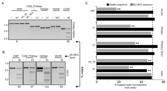 Since the selected nucleases were specific for the mutated STAT3 alleles, their cognate target sites could only be found in patient-derived cells. Before approaching this source of limited cells, we sought to establish the most efficient conditions to achieve high gene disruption frequencies in human PBMCs. As a control, we used a CCR5-specific nuclease (CCR5#2) that was previously established in our laboratory [25]. In addition, we tested the selected STAT3 allele-specific nucleases for disruption of the non-mutated STAT3 gene in cells derived from an healthy donor. We activated the PBMCs with beads coupled with anti-CD2, -CD3 or -CD28 antibodies to expand the lymphocyte fraction. The beads were removed from the medium one day prior to nucleofection of the cells with the indicated RNPs. The indel frequency was determined ten days later via the T7E1 assay (Figure 3A). The CCR5-specific nuclease efficiently induced indel mutations at its intended target site with frequencies approaching 65%, which is in line with our previous report. Importantly, the STAT3 allele-specific nucleases did not introduce indel mutation on the healthy STAT3 allele, while the non-selective H1 nuclease retained its ability to target the STAT3 gene in primary human cells, introducing indels with a frequency of about 6%. CRISPR-Cas nucleases including the CCR5-targeting nuclease as a control were then transferred into PBMCs from STAT3-HIES patients harboring any of the four selected STAT3 mutations. Since the patient-derived cells expanded more slowly than the healthy donor cells, we measured the indel frequency between days 7 and 14 post-nucleofection via the T7E1 assay (Figure 3B). Indel deposition at the CCR5 target ranged from 40% to 60% in the patient-derived cells, respectively (Figure 3B). Then, we measured the ability of each of the selected allele-specific nuclease (H1, H1_19, C1, V1, and VM1) to target the mutated STAT3 allele by next generation targeted amplicon sequencing (NGS).