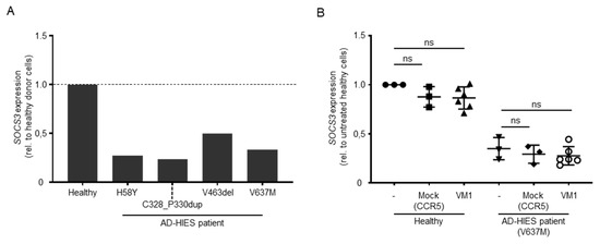 Previous reports have shown a direct transcriptional upregulation of SOCS3, BATF, BCL6, FOSL2, IKZF2, IRF4, RORA, and SMAD7 upon activation of STAT3 signaling [26]. Conversely, the reduction of STAT3 downstream target gene expression has been reported in cells isolated from AD-HIES patients, particularly for SOCS3. We reasoned that the inactivation of the DN-STAT3 allele would result in an increased formation of functional STAT3 homodimers that would exert their function in the transcriptional activation of target genes. To assess which of the STAT3 transcriptional targets responded to the activation of STAT3 signaling in our in vitro culture conditions, we activated PBMCs from healthy donors and expanded them in vitro in the presence of IL-2. Since this cytokine negatively affects STAT3 signaling [27], we cultured the cells for an additional day in its absence prior to activating the STAT3 pathway by culturing the cells for 1 h in the presence of IL-21 [28]. We then analyzed the expression levels of the above-mentioned eight STAT3 target genes via droplet digital PCR. Under these conditions, three genes were upregulated (i.e., SOCS3, BATF, and IRF4 (Figure S3A)). To validate these results in cells that lack STAT3 expression, we artificially inactivated the STAT3 gene in healthy donor PBMCs using a CRISPR-Cas9 nuclease targeted to exon 21 (Table 1). We achieved indels in up to 57% of target alleles, as measured via the T7E1 assay (Figure S3B). This genetic disruption was associated with a marked decrease in the STAT3 protein levels, as shown by Western blot analysis (Figure S3B). As expected, all three selected STAT3 transcriptional targets were downregulated upon STAT3 inactivation (Figure S3C). Since SOCS3 showed the highest reduction in gene expression levels (i.e., 2.3-fold reduction compared to the healthy control cells receiving an unrelated nuclease), we chose to use this gene to monitor for any effects of mutated STAT3 allele disruption in the AD-HIES patient-derived cells. We first validated reduced SOCS3 upregulation in patient-derived cells, which ranged between 2- and 4-fold compared to healthy donor cells (Figure 4A). Although allele-specific disruption of the V637M mutation harboring STAT3 allele was efficacious in patient PBMCs (VM1, Figure 3C), we did not detect the rescue of SOCS3 activation in VM1-edited patient PBMCs upon stimulation with IL-21 (Figure 4B).