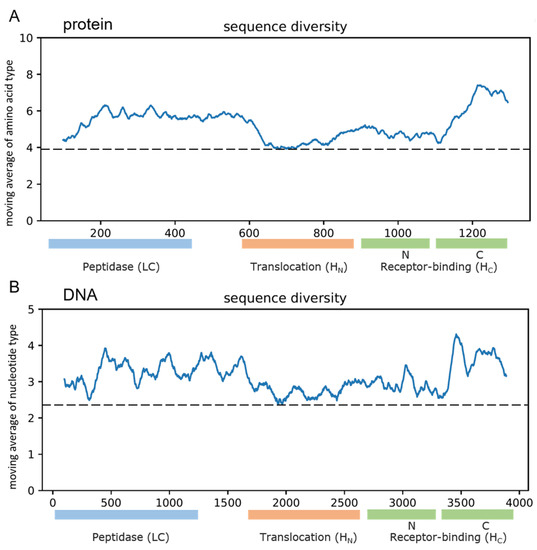 The amino acid and nucleotide diversity distribution of different regions of botulinum neurotoxin (A) protein and (B) gene, respectively. The diversity index (produced by counting the number of unique amino acids or nucleotides in each column in the multiple alignment files) of all of the positions were calculated using C. botulinum 62A BoNT gene as a reference. The moving average (n = 100) of the diversity index was used to generate an overview of the sequence variation. The dashed black horizontal lines demarcate the lowest diversity value in the graph and are used only as visual aid.