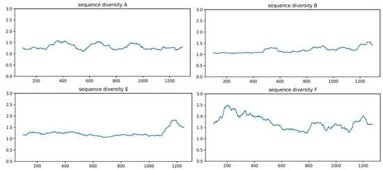 We further compared the protein sequences within each BoNT type, for which a sufficient number of sequences were available (A, B, E and F). A close inspection of the diversity index within each BoNT type revealed that in each position in the alignment file for types A, B and E, there were on average only one to two amino acid types or gaps. The highest variability was found within type F (2.5 on average for some positions, Figure 2). We also conducted similar calculations at the subtype level for the clusters within each type, and we found that the protein sequences within each cluster were even more conserved, with the sequence diversity index being < 1.3 in all of the subtypes (Figure S2). By contrast and not surprisingly, the between-types comparisons showed more amino acid variability for the BoNT proteins (with the diversity index value > 3.9 on moving average), reaching a maximum of eight different amino acids per position along the HCC domain (Figure 1A). To recap, the protein sequences were found to be highly conserved within each BoNT type, and they were even more conserved within the subtypes, and highly variable between the types, with the highest amino acid variability being observed along the HCC subdomain.