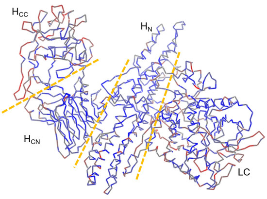 - Kumaran, D.; Eswaramoorthy, S.; Furey, W.; Navaza, J.; Sax, M.; Swaminathan, S. Domain Organization in Clostridium Botulinum Neurotoxin Type E Is Unique: Its Implication in Faster Translocation. J. Mol. Biol. 2009, 386, 233–245. [Google Scholar] [CrossRef]