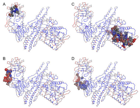 Three-dimensional structure of BoNT protein and the interacting sites with (A) ganglioside, (B) SV2, (C) SNAP-25 substrate and (D) monoclonal antibody CR1 against BoNT toxin. The diversity index of each position were mapped onto the 3D structure indicted by the color (from blue to grey to red, low to medium to high). The interacting amino acids were highlighted as spheres with color indicating the diversity index.