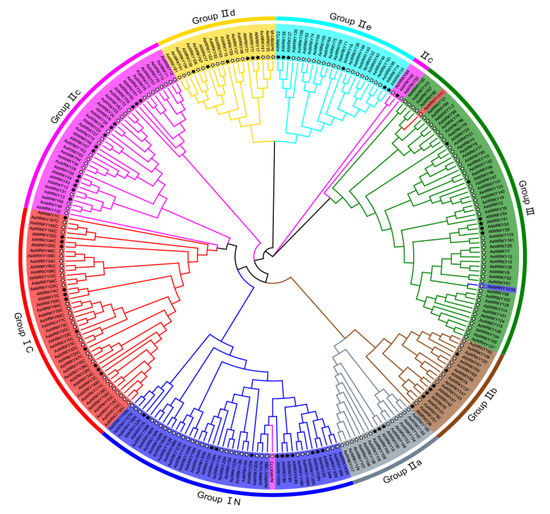 A phylogenetic tree containing about 60 amino acids of the WRKY domains was constructed. According to previous studies on WRKY genes, their phylogenetic relationships, and WRKY domain characteristics of A. thaliana, the WRKY genes of oat and Arabidopsis could be divided into three groups–namely, I, II, and III (Figure 2). Group II was further divided into five subgroups (IIa, IIb, IIc, IId, and IIe). It is worth noting that AsWRKY73 is clustered with group IN; they seem to have a more similar evolutionary relationship. Further analysis showed that AsWRKY131 is highly homologous in terms of its zinc finger structure with group III; it is speculated whether AsWRKY131 underwent transfer, mismatch, or recombination during chromosomal replication. Surprisingly, AsWRKY86 and AsWRKY92 belong to group IIc, although these were closer to group III. Is this related to the mutation of these two conserved domains? In contrast to group I, group II (83 AsWRKYs) contains a single WRKY domain. Thirteen members were found in subgroup IIa, 11 in IIb, 27 in IIc, 14 in IId, and 18 in IIe.